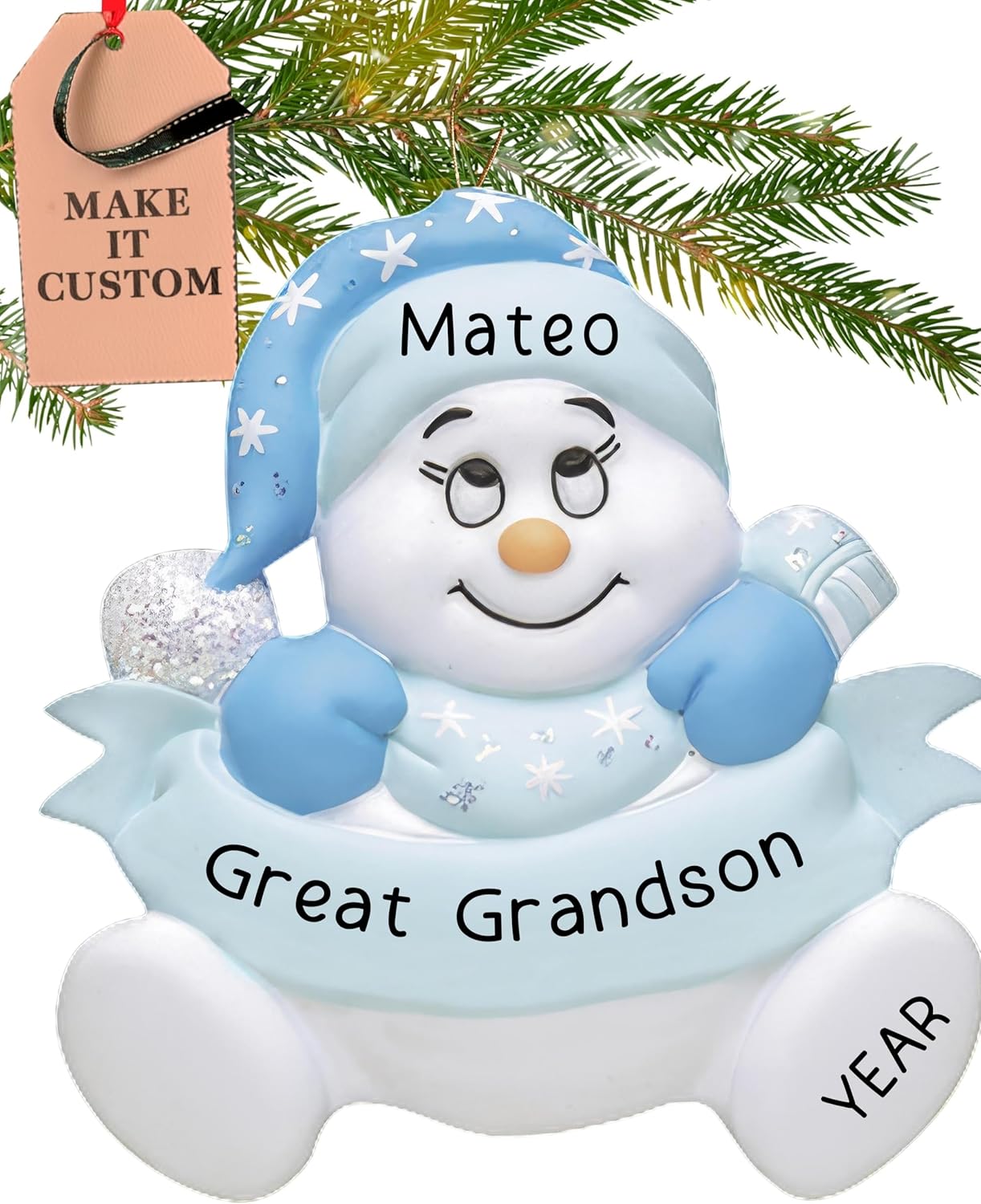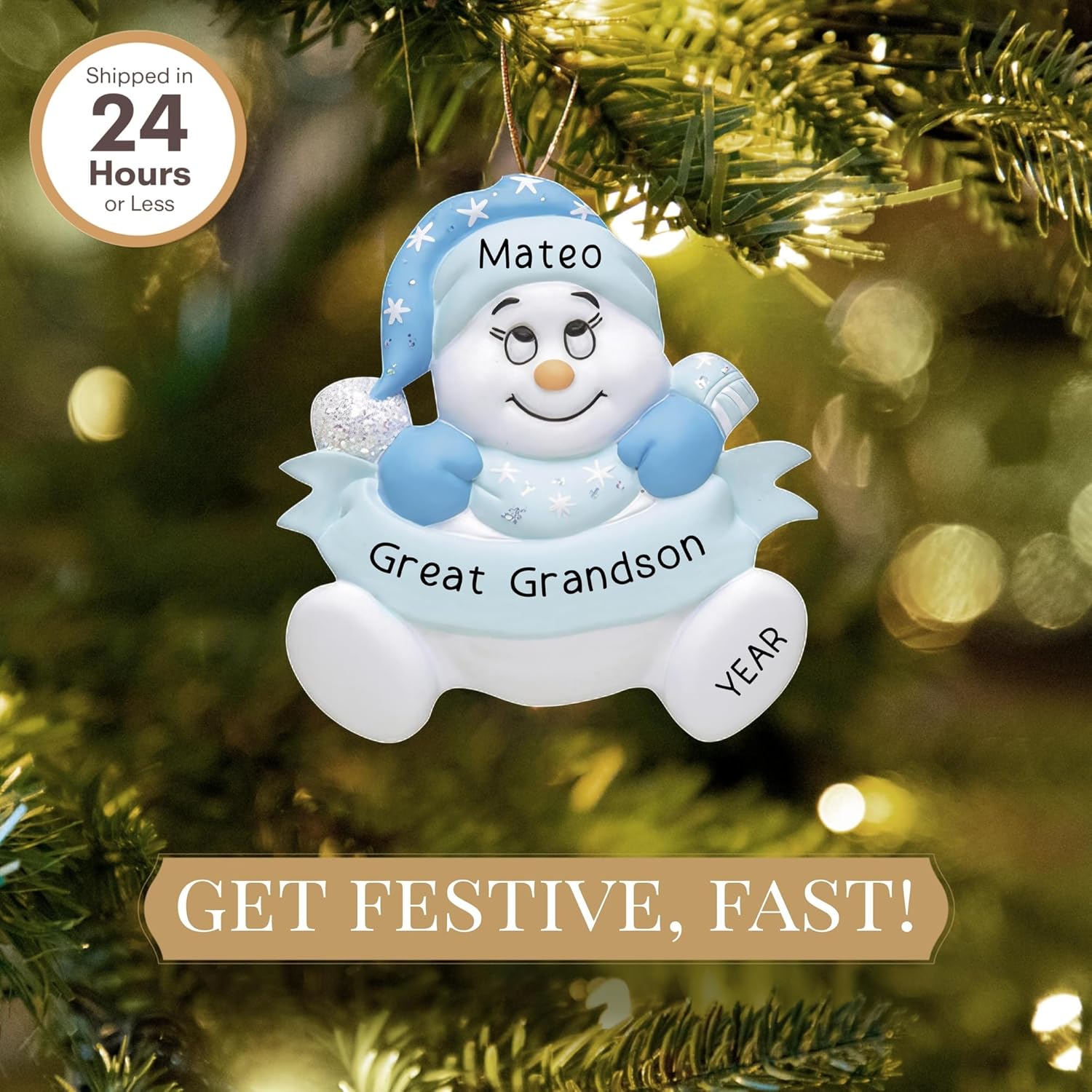Personalized Great Grandson Ornament 2025 | Free 24h Customization | Laser Engraved Grandparents Christmas Ornaments for Tree | Custom Gift Wrapped Blue Snowbaby Keepsake for Grandpa & Grandma