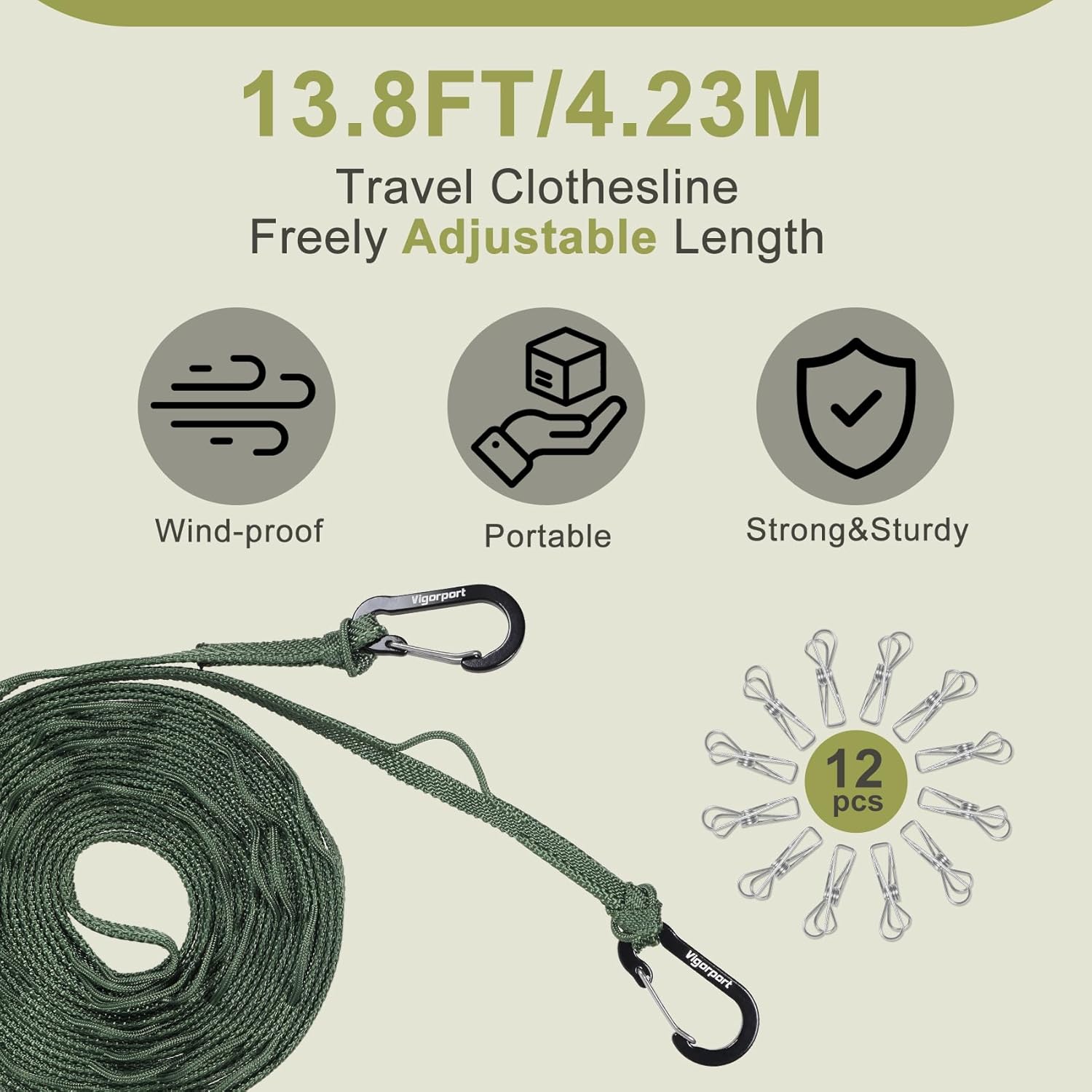 Vigorport Portable Travel Clothesline, Windproof Clothes Line with Hang Hole, Indoor and Outdoor Laundry Line with Clothespins for Hotel, Camping, RV, Cruise Ship (Green, 13.8Ft)