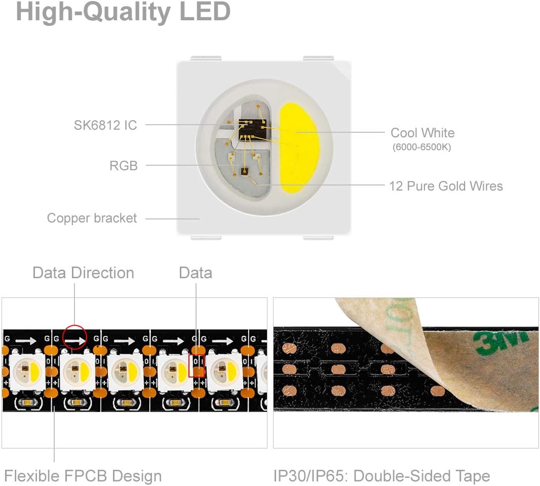 BTF-LIGHTING RGBW RGB+Cool White SK6812 (Similar WS2812B) Individually Addressable 3.3ft 1m 144(2X72) LEDs Flexible 4 Colors in 1 LED Dream Color LED Strip IP30 Non-Waterproof DC5V Black PCB