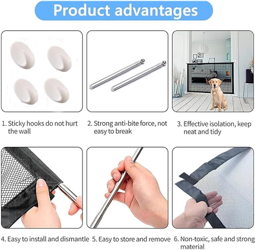 Installation is a breeze with the Magic Dog Gate. It comes with adhesive hooks that can be attached to walls, making it easy to set up and remove without causing damage. This gate is lightweight and portable, making it perfect for travel or temporary use.