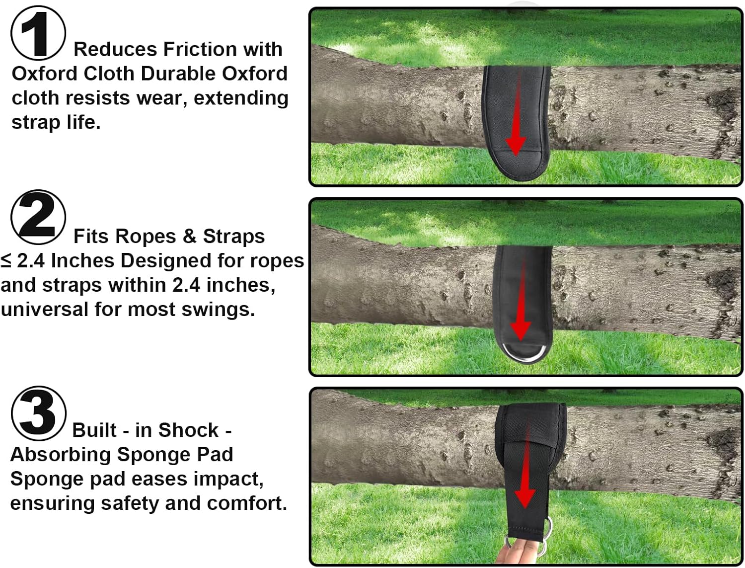Customers can rest easy knowing these swing straps prioritize safety. With their heavy-duty material and secure attachment mechanisms, these straps firmly hold swings in place, reducing the risk of accidents. The protective sleeves provide an extra layer of safety, minimizing the impact on trees and attachment points. These straps are a reliable and practical choice for families and outdoor enthusiasts alike.