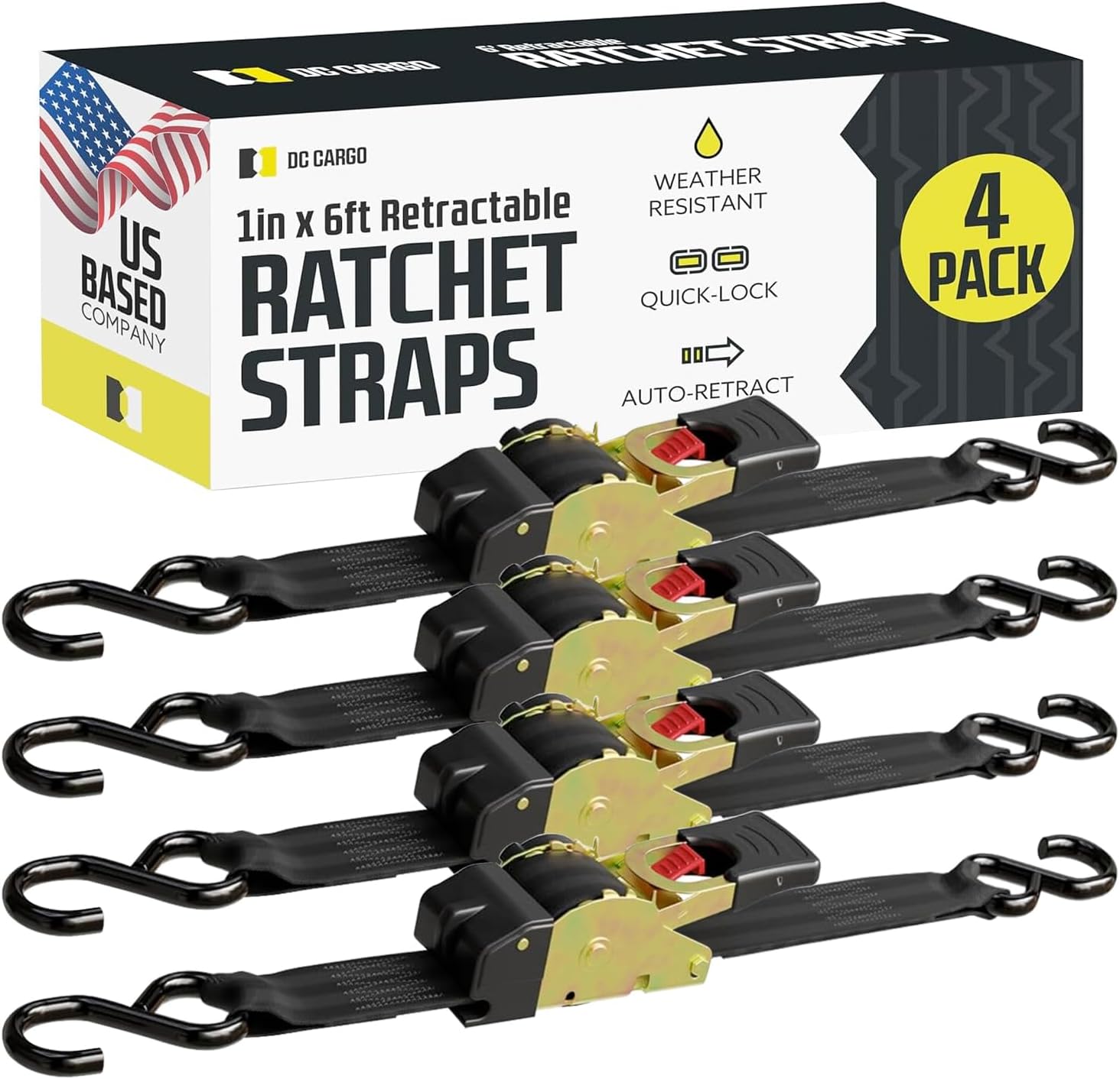 DC Cargo Mall Auto Retractable Ratchet Straps (4-Pack) 1” x 6ft, Heavy Duty, 1,522lb Break Strength – Tie Down Straps for Cargo, Truck, Trailer, Motorcycle, Boat