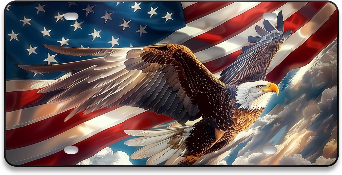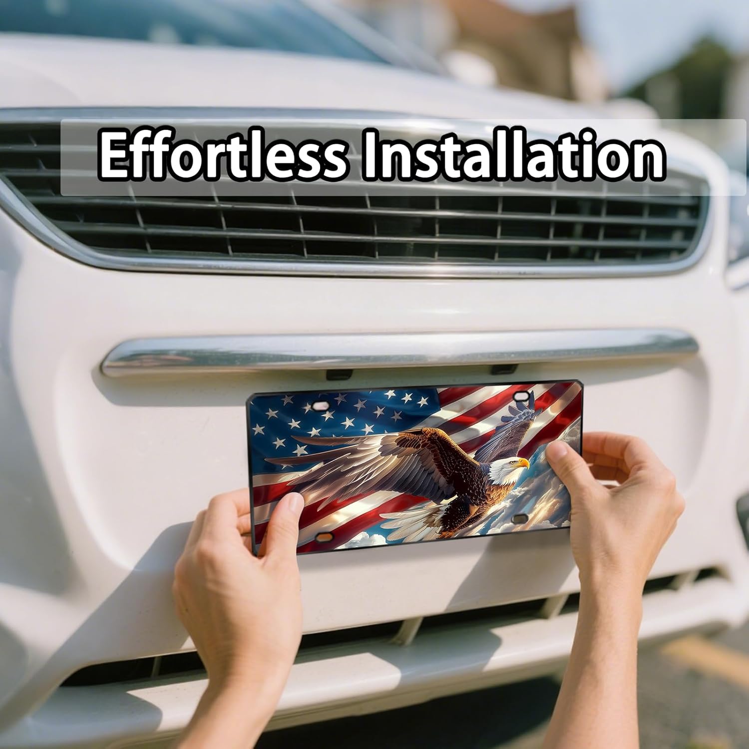 Front License Plate Cover - License Plate with American Flag & Eagle, Aluminum Decorative License Plates, Patriotic Novelty Vanity Tag, Car Decor Accessory with 4 Holes, 6×12 inch Car Plates Decor