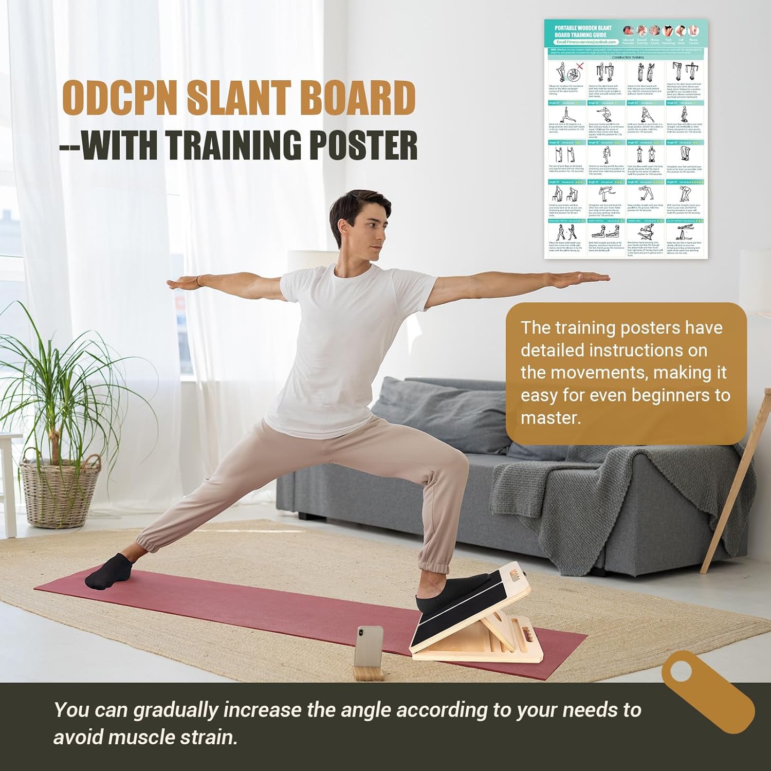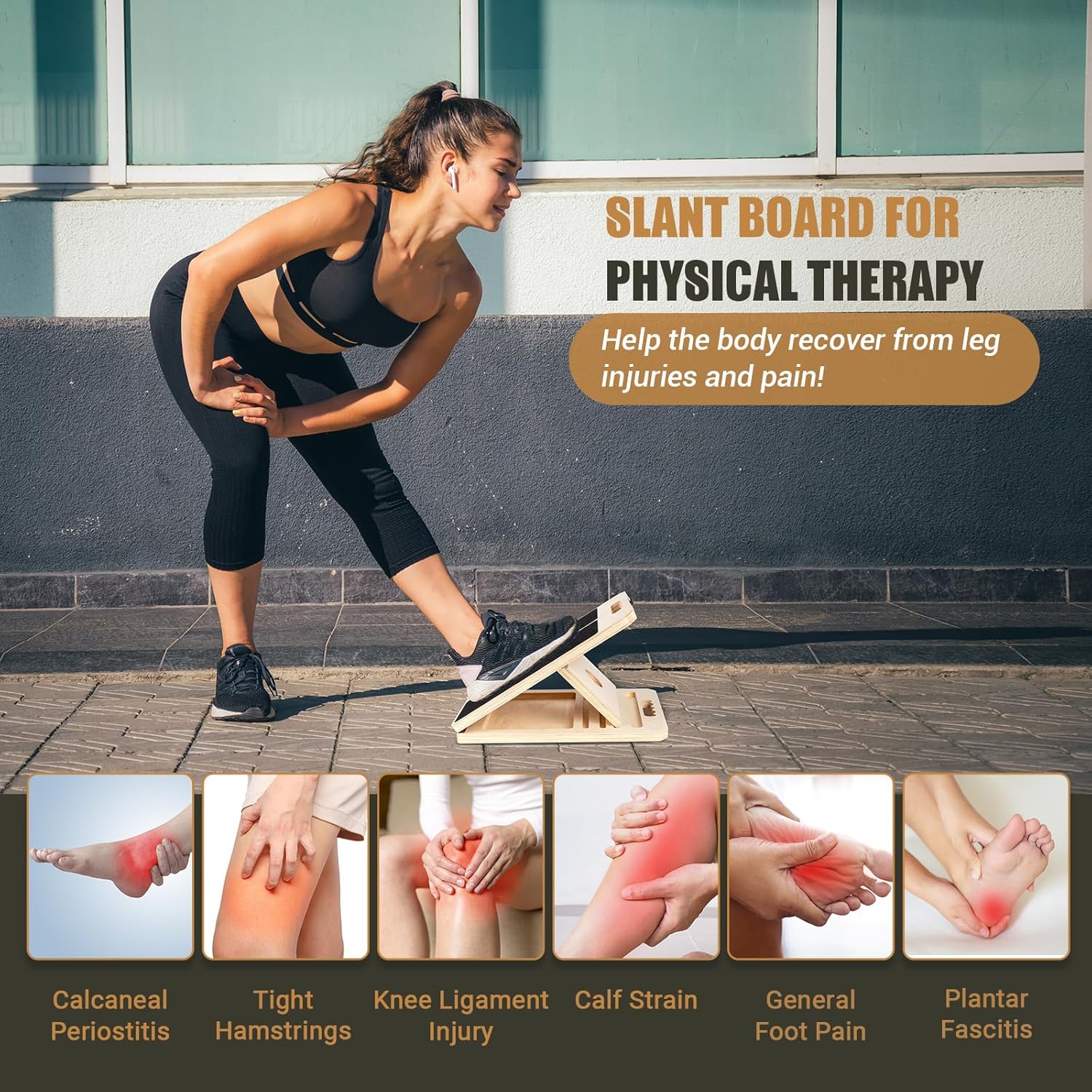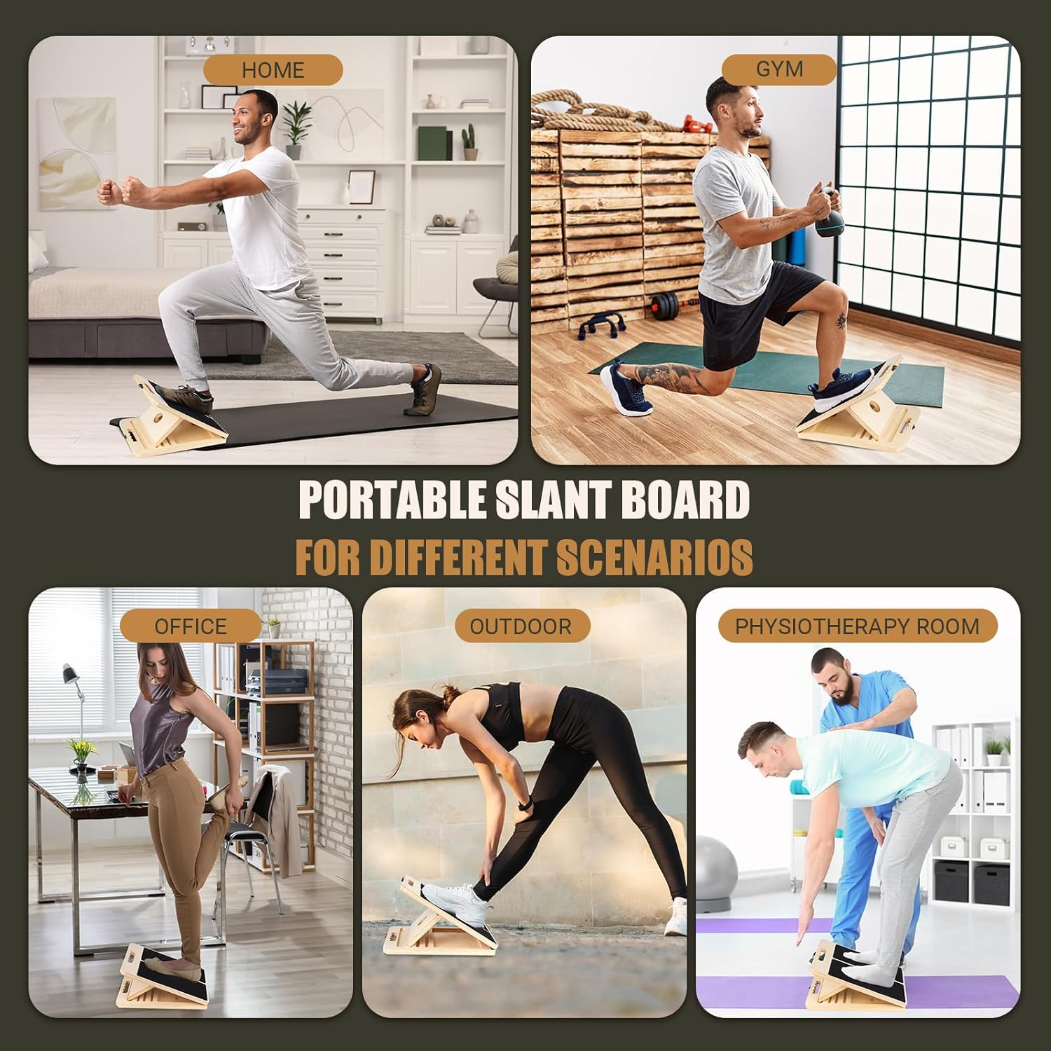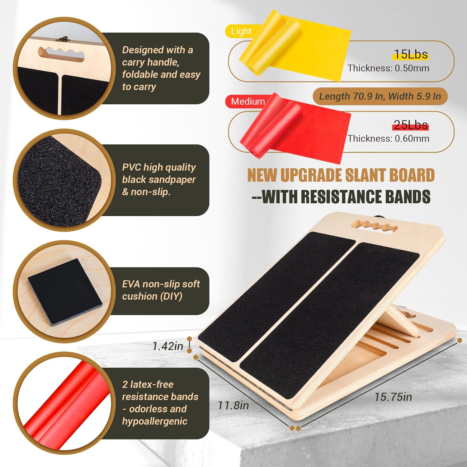 Wooden Slant Board for Calf Stretching, Portable Adjustable Calf Stretch Board with Training Poster & Resistance Bands, 300lb Weight Capacity Calf Ankle Achilles Physical Therapy Leg Exercisers