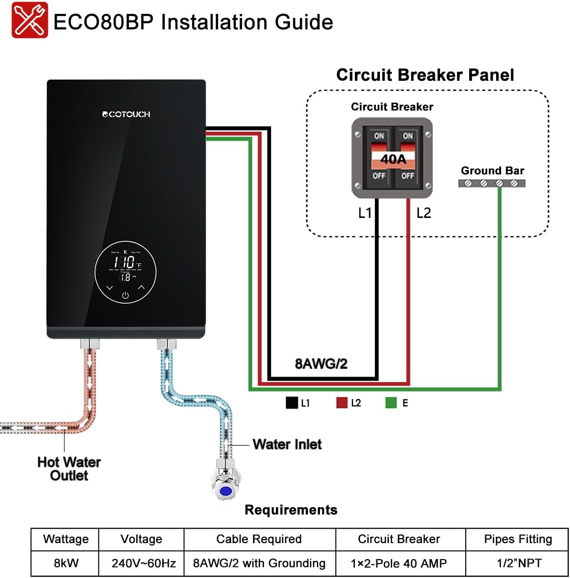 The ECOTOUCH ECO80BP is a tankless electric water heater built for residential use, designed to provide instant hot water on demand. It offers energy and space-saving benefits compared to traditional tank water heaters, making it a great option for smaller homes or spaces where a typical water heater might not fit well. This water heater has a sleek and compact design, making it practical for a variety of settings. The ETL certification ensures that this water heater meets safety and quality standards for users.